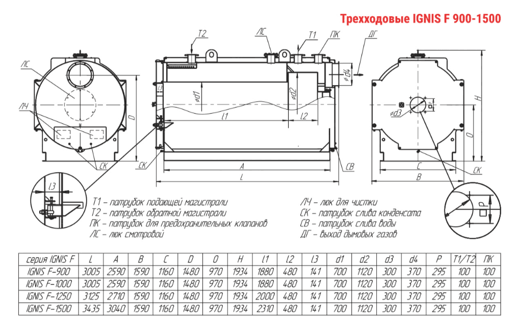 Технические характеристики водогрейного трёхходового котла ARCUS IGNIS F-1000